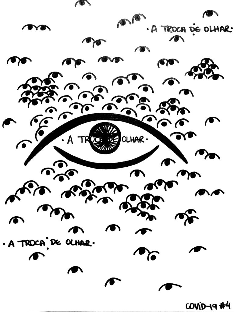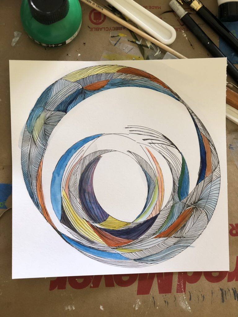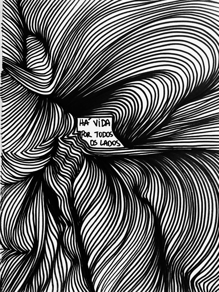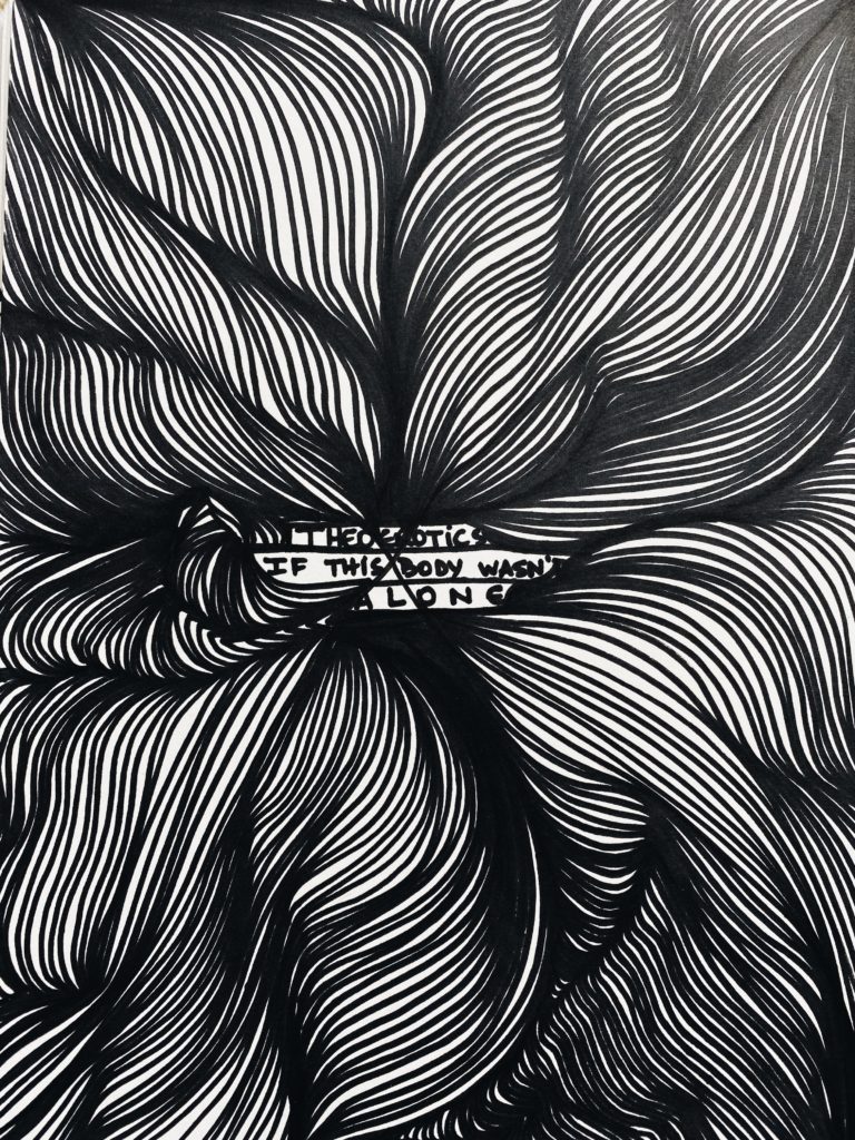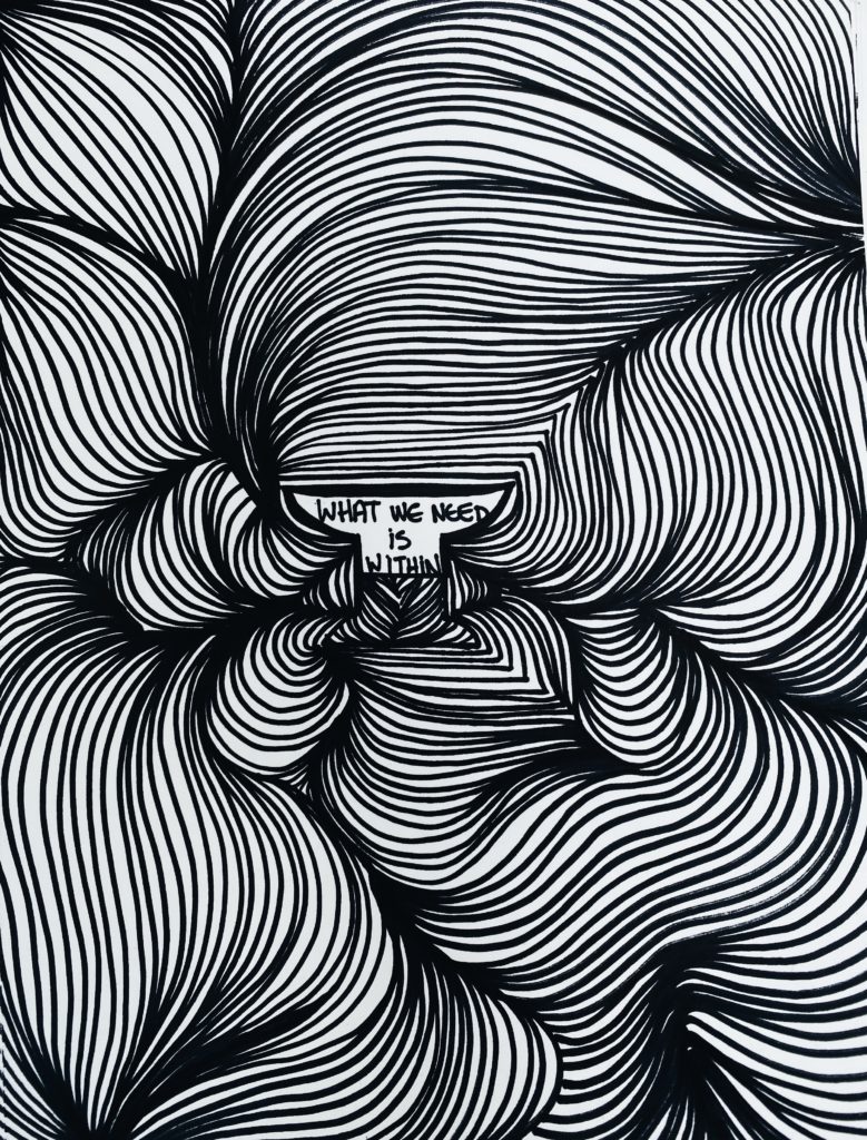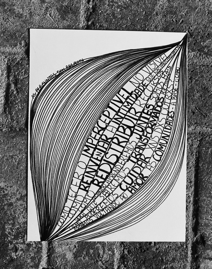 These images are part of my meditation exercises during COVID-19. I describe this spiritual practice as a breathing-being-praying meditation. Beginning by centering myself, breathing in and out deeply, and noticing a word that emerges for me, I write the word at the center of the paper. This word is a reflection of how I sense and name my most urgent needs, the desires of my spirit, my body-prayer, minha gratidão. I then begin by inhaling deeply and drawing one line, exhaling deeply and drawing another line. I do this until the page is filled with lines that reflect current patterns of being and breathing–my heart frequency.