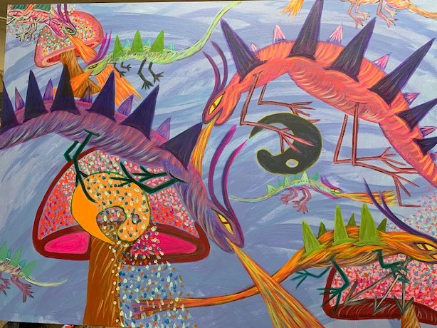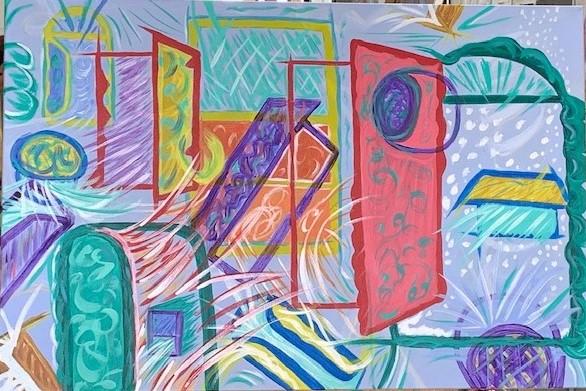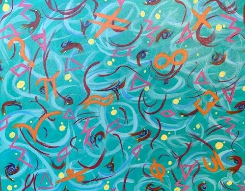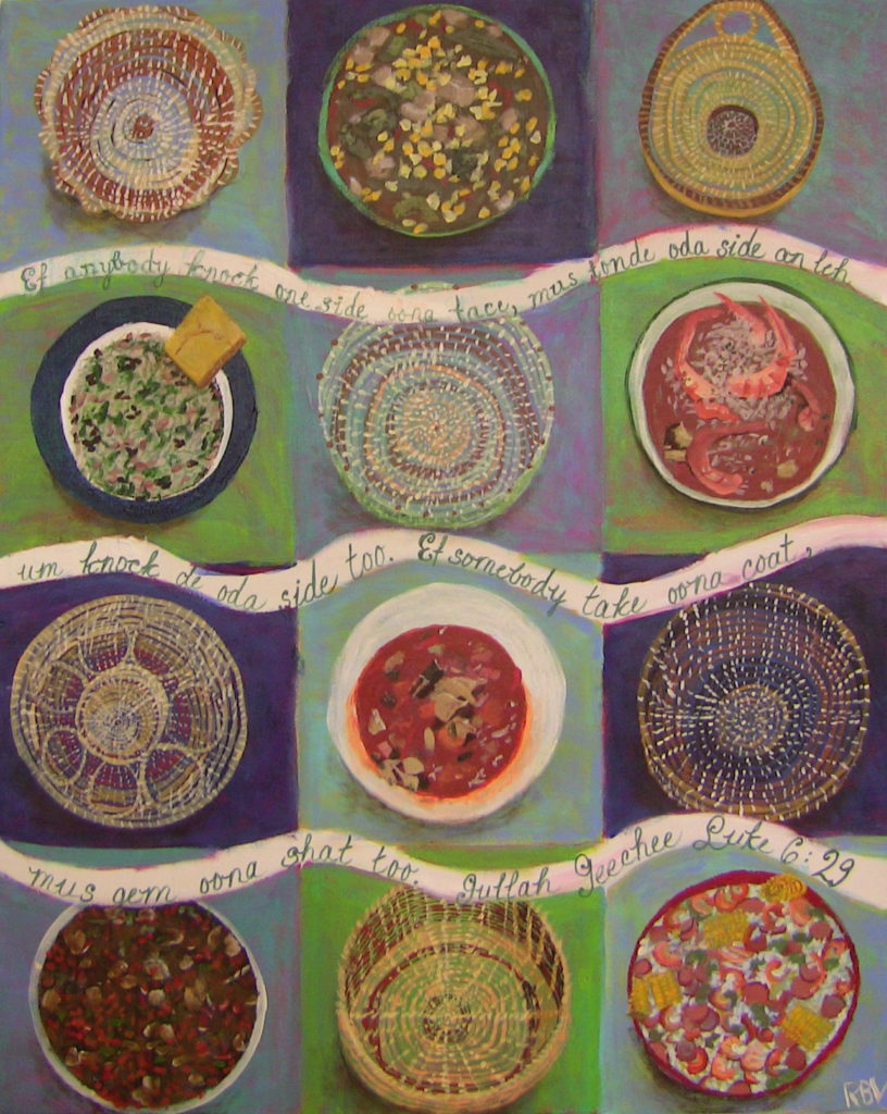 "Gullah Geechee comes right from this teaching. When I visited the outer banks of South Carolina, I learned about the Gullah people, whose ancestors were slaves, that live there still. These people are famous for their basket weaving using sea grass. This painting combines the baskets with the Do Unto Others saying in the language of the Gullah. And of course, one of the main features of the painting is the food. Oh, my, who doesn't love food? And so this goes out to people who desperately need food especially in these times, with words of kindness."